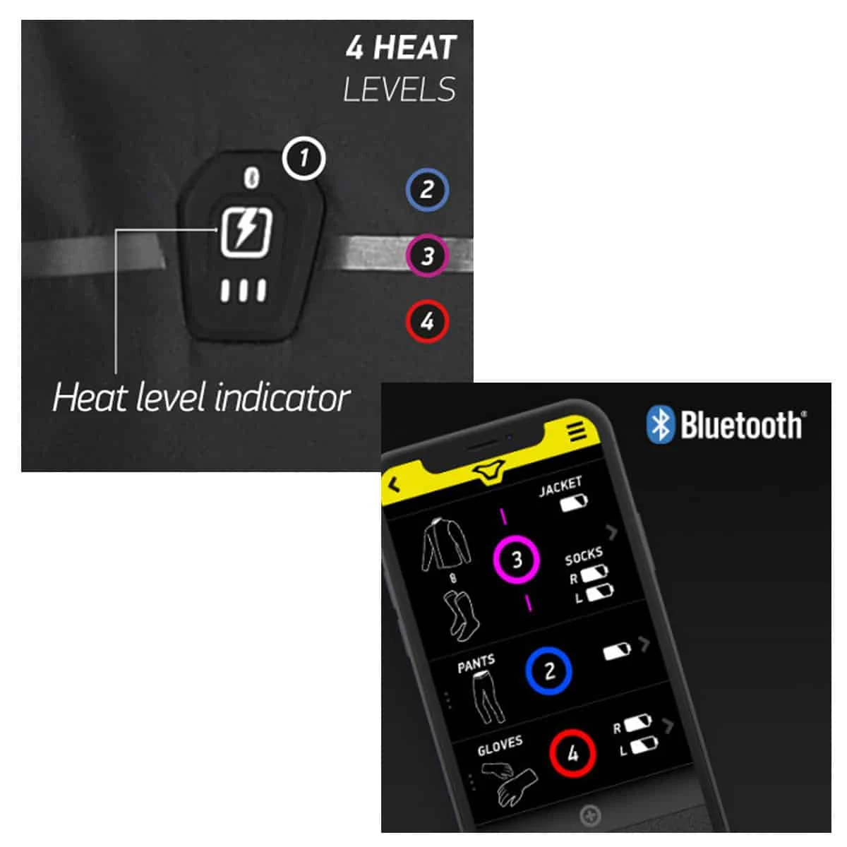 • Bluetooth Connectivity to MACNA app to control heat settings without having to undo the jacket or over jacket